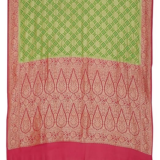 Banarasi Silk Works Presenting Parrot Green Pure Banarasi Khaddi Chiffon Gorgette Meena Gharchola Weaving Kadiyal Pink Border. कारीगरी: Woven with bright colour and zari yarn, a workXMAnship with balanced harmony of contrasting colour synchronization, a banarasi silk story.