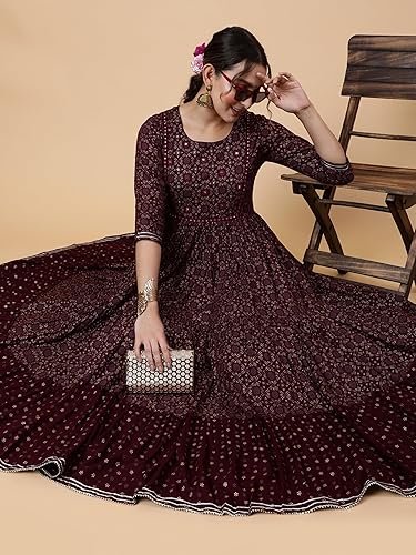 Ethnic Printed Cotton Blend Anarkali Dress, Burgundy, 3/4 Sleeve, Round Neck, Fit & Flare