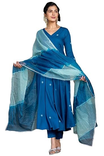 GoSriKi Women’s Cotton Blend Anarkali Embroidered Kurta with Pant & Dupatta