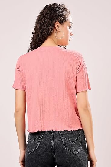 Slim Fit Textured Stretchable Round Neck Textured Knit Short Sleeve Pink Crop Top for Women